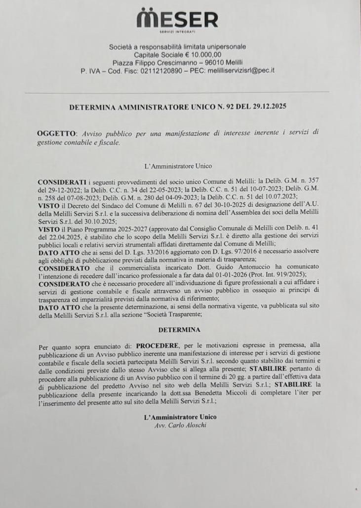 La società partecipata Melilli Servizi S.r.l. intende acquisire manifestazioni di interesse per l'affidamento sotto-soglia dei servizi di gestione contabile e fiscale e di consulenza contabile e fiscale, nel rispetto dei principi di trasparenza, concorrenza, rotazione e parità di trattamento.